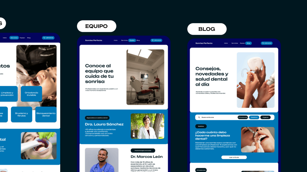 Sonrisa Perfecta es una plantilla gratuita y premium diseñada en Figma, ideal para crear la página web de una clínica dental, centro de salud o consultorio médico.
