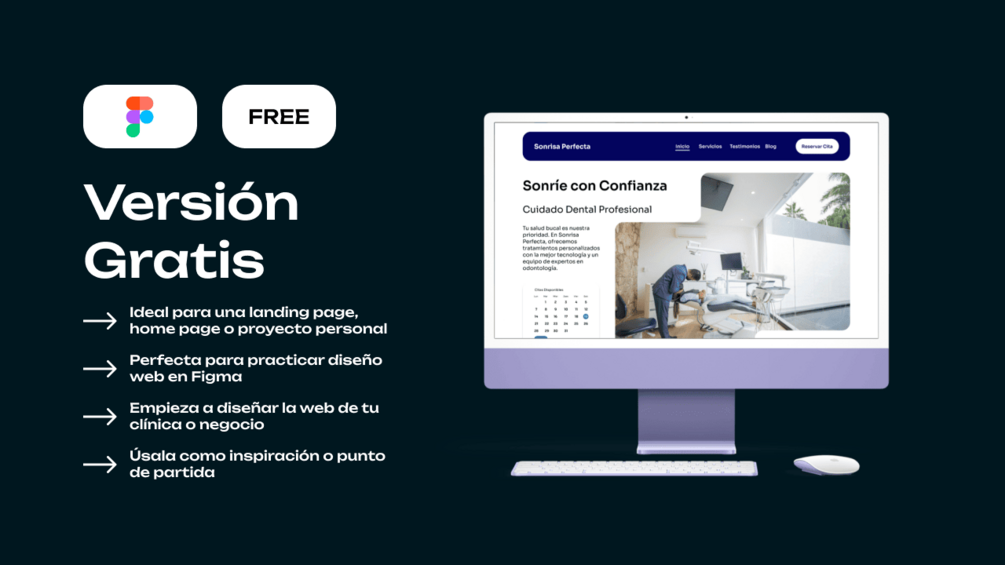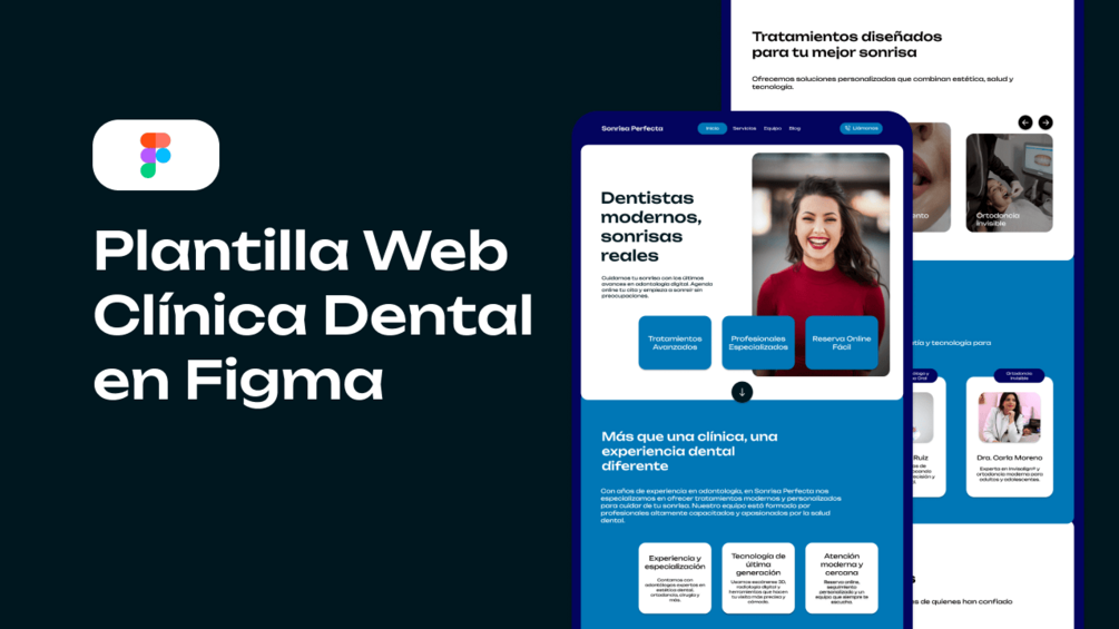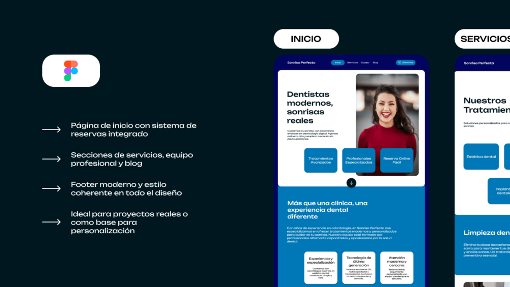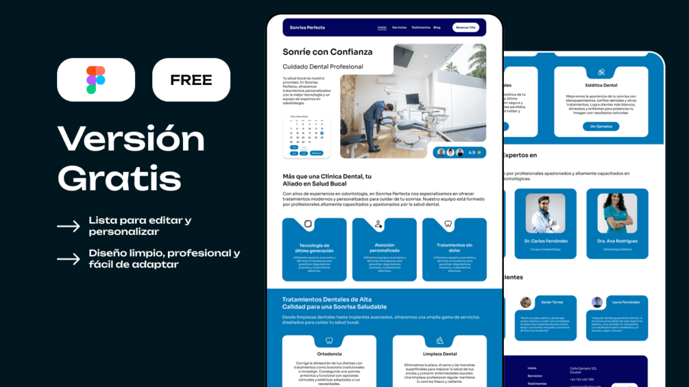 Sonrisa Perfecta es una plantilla gratuita y premium diseñada en Figma, ideal para crear la página web de una clínica dental, centro de salud o consultorio médico.